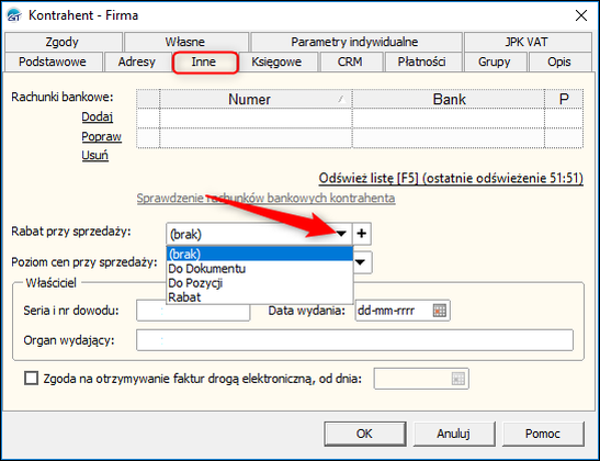 2. W zakładce Inne rozwinąć opcję Rabat przy sprzedaży. Na liście dostępne są rabaty zdefiniowane przez użytkownika w module Słowniki – Rabaty, gdzie można przypisać wartość wszystkich rabatów wykorzystywanych przy wystawianiu dokumentów handlowych oraz przy edycji towarów i kontrahentów.