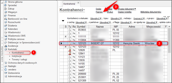1. Przejść do modułu Kartoteki – Kontrahenci, a następnie wybierając opcję Popraw przejść do okna edycji.