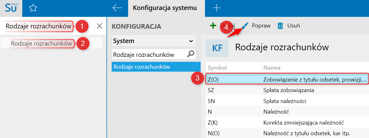 1. W lewym, górnym rogu programu, w wyszukiwarce wpisać Rodzaje rozrachunków, wejść w wyszukany moduł, wybrać odpowiedni rodzaj rozrachunku i kliknąć górne menu Popraw.