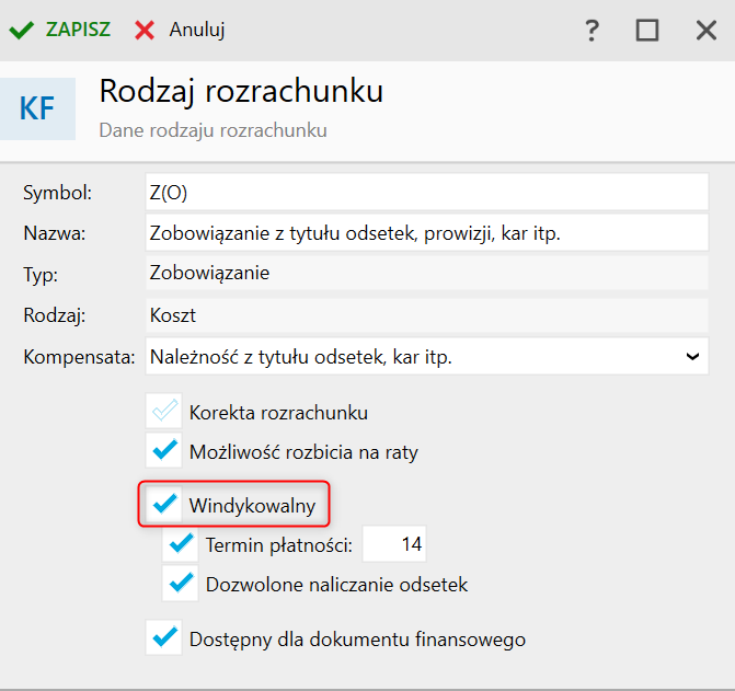 2. Zaznaczyć Windykowalny i zatwierdzić przyciskiem Zapisz.