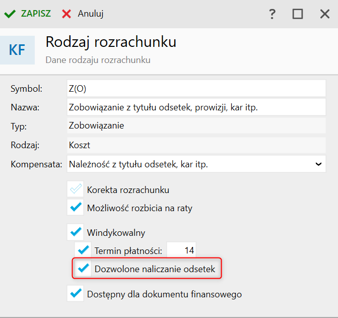 2. Zaznaczyć Dozwolone naliczanie odsetek i zatwierdzić przyciskiem Zapisz.
