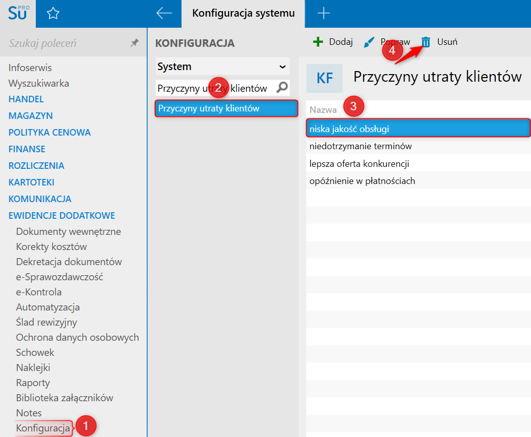 1. Przejść do modułu Ewidencje dodatkowe – Konfiguracja – Przyczyny utraty klientów, zaznaczyć jeden z rabatów i z górnego menu wybrać Usuń.
