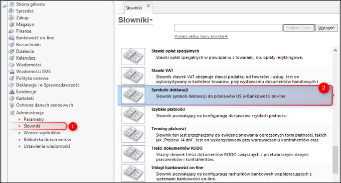 1. Przejść do modułu Administracja – Słowniki i wybrać z listy Symbole deklaracji.