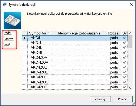 2. Słownik zawiera predefiniowane symbole (nie można usunąć systemowego symbolu deklaracji). Istnieje również możliwość dodawania symboli deklaracji.