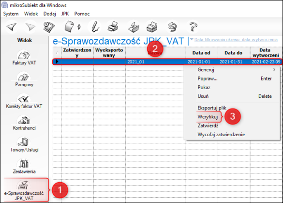 Aby zweryfikować poprawność struktury pliku JPK, należy przejść do modułu e-Sprawozdawczość JPK_VAT, kliknąć prawym przyciskiem myszy na wygenerowanym pliku JPK i wybrać Weryfikuj.