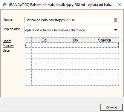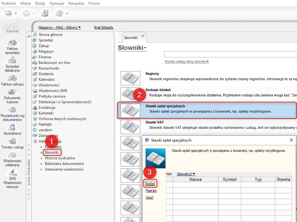 1. Przejść do modułu Administracja – Słowniki – Stawki opłat specjalnych i w nowym oknie kliknąć Dodaj.