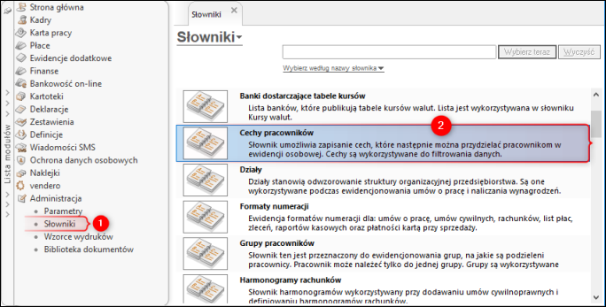 1. Przejść do modułu Słowniki - Cechy pracowników.