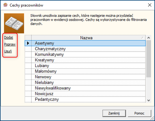 Słownik cech pracowników zawiera pozycje, które użytkownik może przypisać w ewidencji osobowej. Aby zdefiniować nowe cechy pracowników, należy: