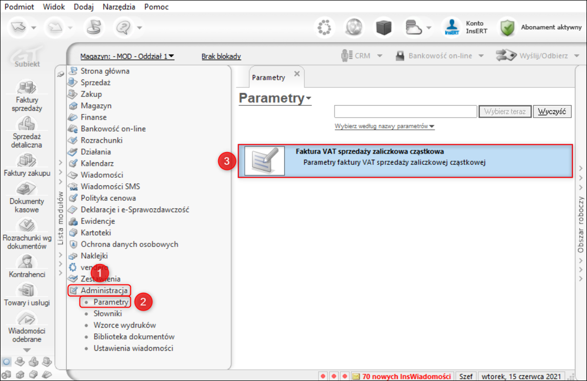 1. Z listy modułów wybrać Administracja – Parametry, a z listy parametrów Faktura VAT sprzedaży zaliczkowa cząstkowa.