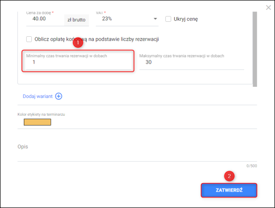 4. Wskazać wybraną wartość w polu Minimalny czas trwania rezerwacji w dobach/dniach. Zapisać zmiany przyciskiem Zatwierdź.