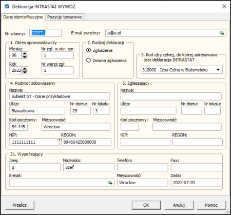 2. Wprowadzić nowe dane i zatwierdzić przyciskiem OK. Aby zaczytać na nowo pozycje towarowe, należy kliknąć Przelicz.