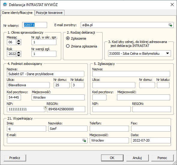 2. Wprowadzić nowe dane i zatwierdzić przyciskiem OK. Aby zaczytać na nowo pozycje towarowe, należy kliknąć Przelicz.