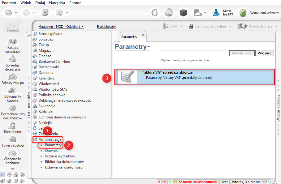 1. Z listy modułów wybrać Administracja – Parametry, a z listy parametrów Faktura VAT sprzedaży zbiorcza.
