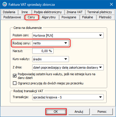 Subiekt GT – Jak ustawić domyślny rodzaj ceny faktury VAT sprzedaży zbiorczej?