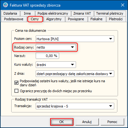 2. W oknie, które się wyświetli przejść na zakładkę Ceny i ustawić domyślny Rodzaj ceny. Zmiany zapisać przyciskiem OK.