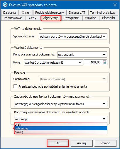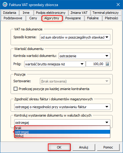 2. W oknie, które się wyświetli przejść na zakładkę Algorytmy i wybrać odpowiednią opcję w sekcji Kontroluj wystawianie dokumentu w walutach obcych. Zmiany zapisać przyciskiem OK.
