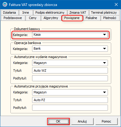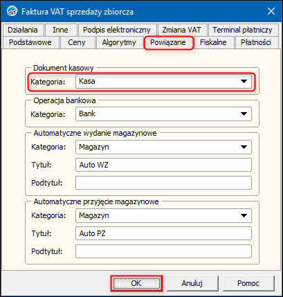 2. W oknie, które się wyświetli przejść na zakładkę Powiązane i wybrać domyślną Kategorię w sekcji Dokument kasowy. Zmiany zapisać przyciskiem OK.