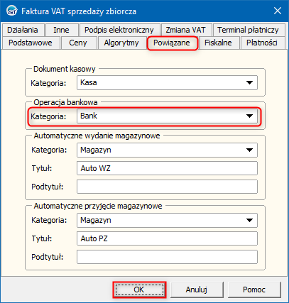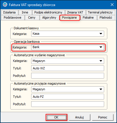 2. W oknie, które się wyświetli przejść na zakładkę Powiązane i wybrać domyślną Kategorię w sekcji Operacja bankowa. Zmiany zapisać przyciskiem OK.