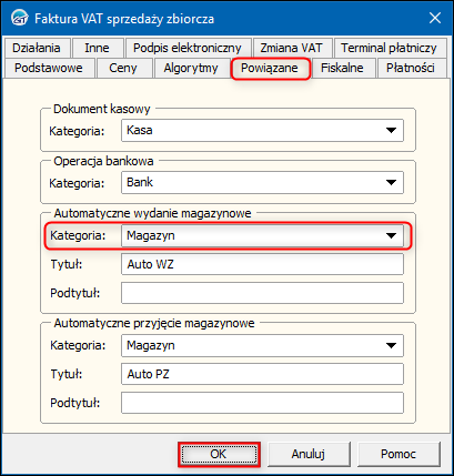 2. W oknie, które się wyświetli przejść na zakładkę Powiązane i wybrać domyślną Kategorię w sekcji Automatyczne wydanie magazynowe. Zmiany zapisać przyciskiem OK.