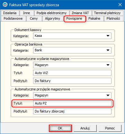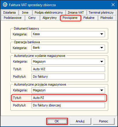 2. W oknie, które się wyświetli przejść na zakładkę Powiązane i wpisać domyślny Tytuł w sekcji Automatyczne przyjęcie magazynowe. Zmiany zapisać przyciskiem OK.