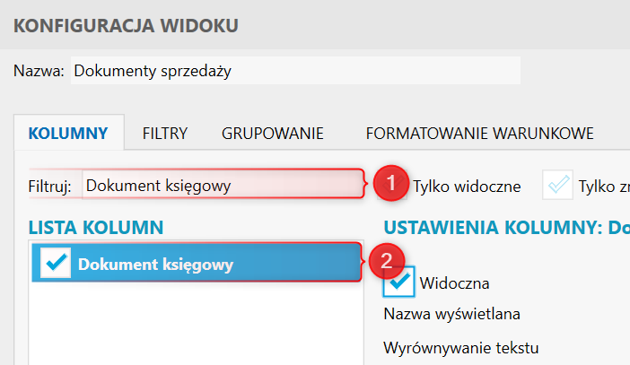 2. W polu Filtruj wpisać Dokument księgowy, zaznaczyć wyszukaną kolumnę na liście i zatwierdzić przyciskiem OK.