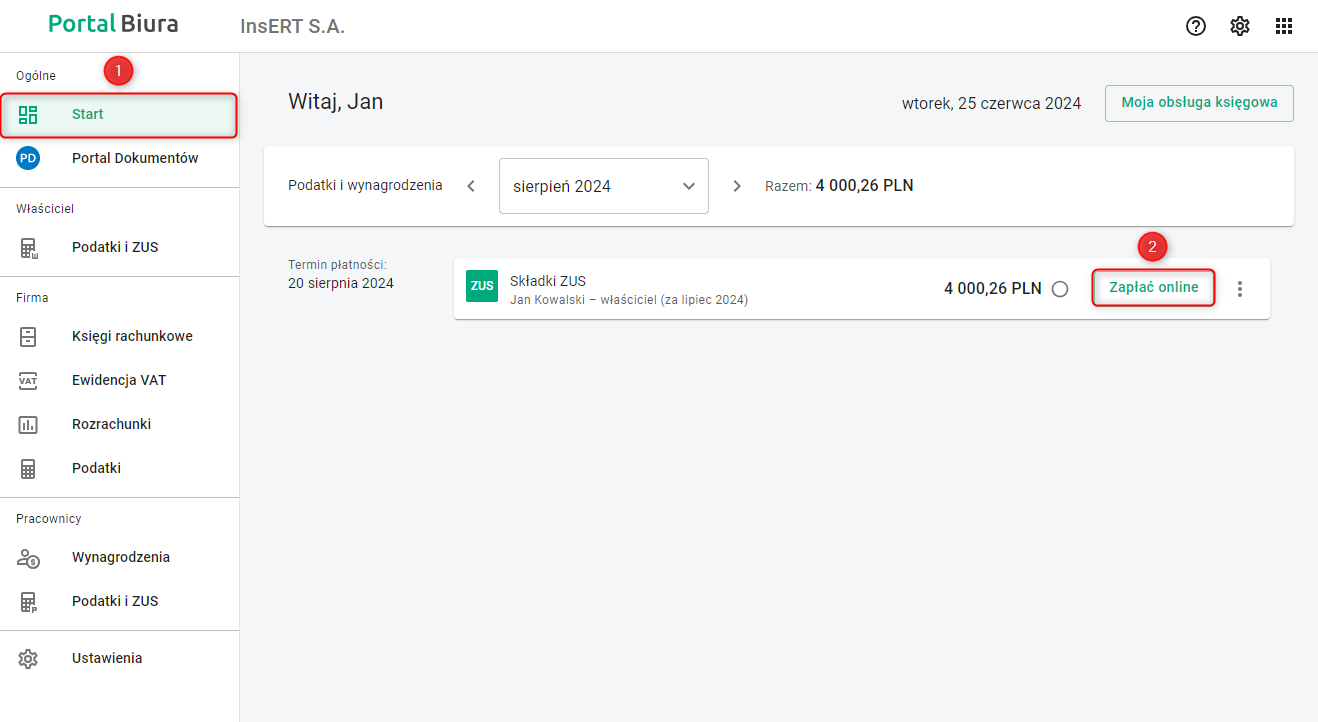 1. Po zalogowaniu się do aplikacji przejść do modułu Start, a następnie przy odpowiedniej zaliczce na podatek lub składkach ZUS kliknąć Zapłać online.