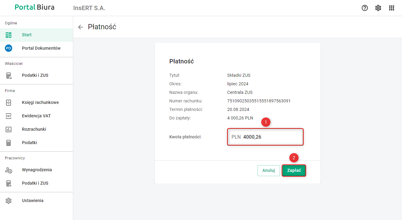 Portal Biura umożliwia skorzystanie z płatności online w celu opłacenia podatku skarbowego oraz składek ZUS. Aby to zrobić, należy: