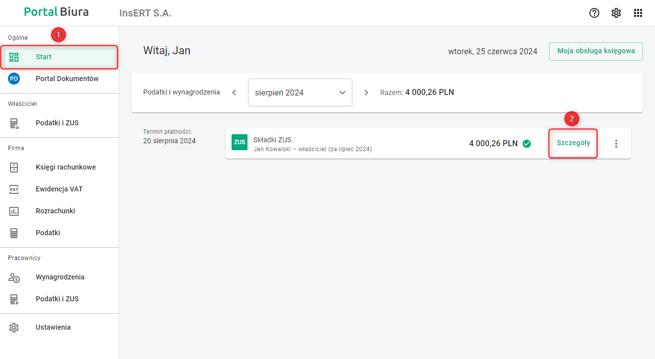 1. W module Start odnaleźć opłaconą składkę ZUS lub zaliczkę na podatek, następnie kliknąć Szczegóły.