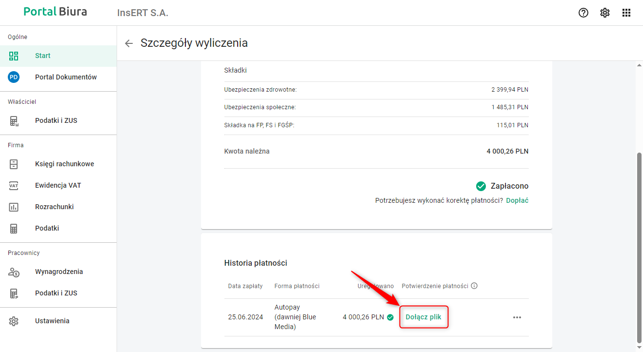 2. W sekcji Historia płatność przy odpowiedniej płatności kliknąć Dołącz plik.