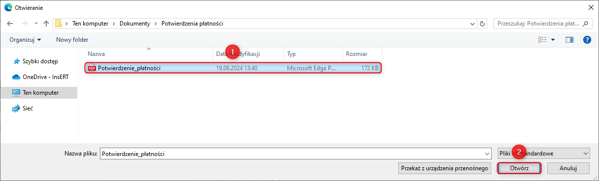 3. Odnaleźć i zaznaczyć potwierdzenie płatności, następnie kliknąć Otwórz. Wybrany plik zostanie przesłany do Portalu.