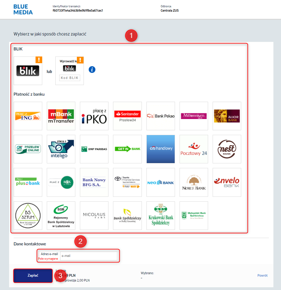 3. Wybrać formę płatności, wpisać Adres e–mail i kliknąć Zapłać.