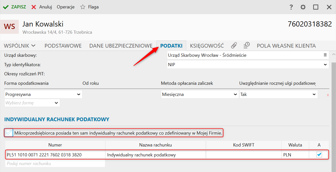 3. Na zakładce Podatki uzupełnić indywidualny rachunek podatkowy (mikrorachunek). Analogicznie jak w przypadku rachunków składek ZUS istnieje możliwość wskazania, że Mikroprzedsiębiorca posiada ten sam indywidualny rachunek podatkowy co zdefiniowany w Mojej Firmie.