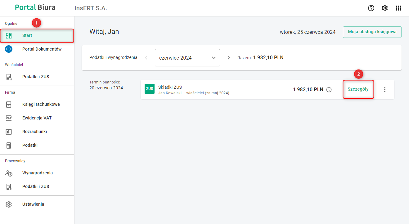 1. Po zalogowaniu się do aplikacji przejść do modułu Start, następnie przy odpowiedniej zaliczce na podatek lub składkach ZUS, dla których płatność została przerwana kliknąć Szczegóły.