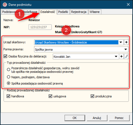 2. W nowym oknie należy przejść na zakładkę Działalność i wskazać Urząd skarbowy, Formę prawną, ustalić, czy ma być wskazana Osoba fizyczna do deklaracji, a także wybrać Typ prowadzonej działalności.