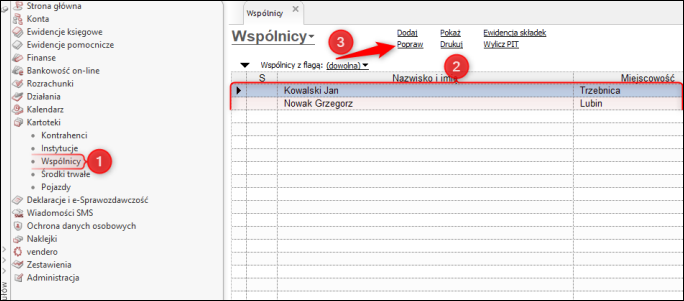 W celu weryfikacji lub wprowadzenia danych wprowadzonych w kartotece wspólnika należy: