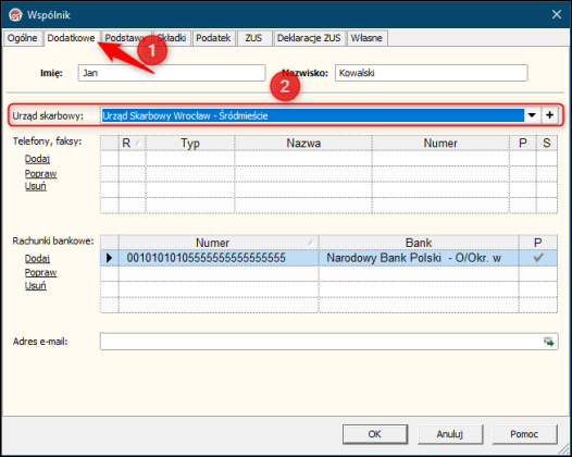 2. Na zakładce Dodatkowe zweryfikować bądź wskazać odpowiedni Urząd Skarbowy.