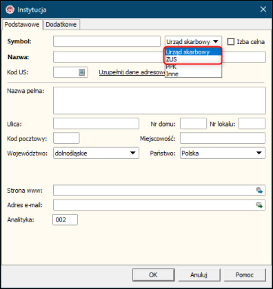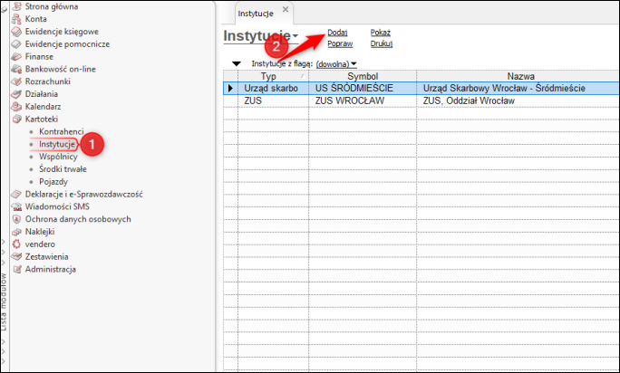 W module Instytucje można ewidencjonować m.in. dane o organach podatkowych, oddziałach ZUS i innych typach instytucji. Aby dodać Instytucje typu Urząd skarbowy lub ZUS, należy: