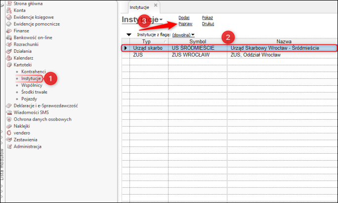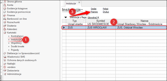 1. Przejść do modułu Instytucje, zaznaczyć odpowiednią Instytucję ZUS i kliknąć Popraw.