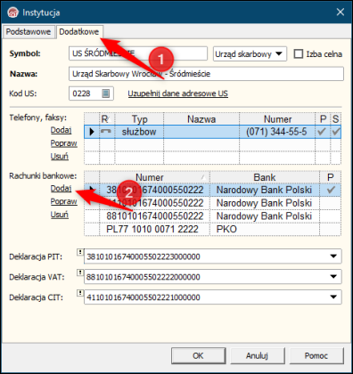 2. Na zakładce Dodatkowe w sekcji Rachunki bankowe dodać nowy rachunek.