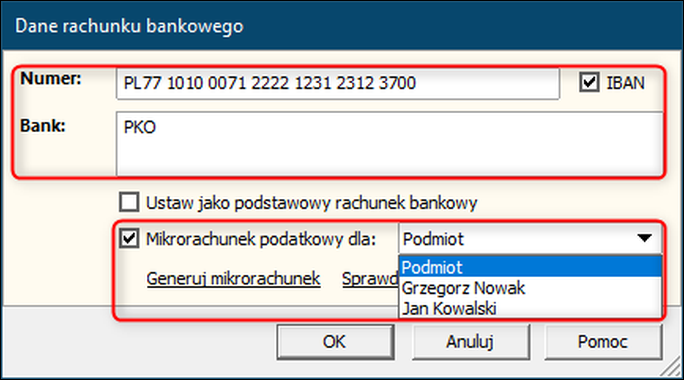 3. Wprowadzić Numer rachunku i nazwę Banku, a następnie zaznaczyć opcję Mikrorachunek podstawowy dla i wybrać Podmiot lub odpowiedniego ze Wspólnika.