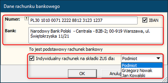 3. Wprowadzić Numer rachunku i nazwę Banku, a następnie zaznaczyć opcję Indywidualny rachunek na składki ZUS dla i wybrać Podmiot lub odpowiedniego ze Wspólnika.
