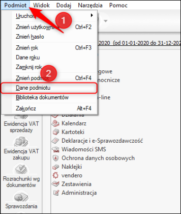 1. W lewym, górnym rogu programu kliknąć Pomiot – Dane podmiotu.