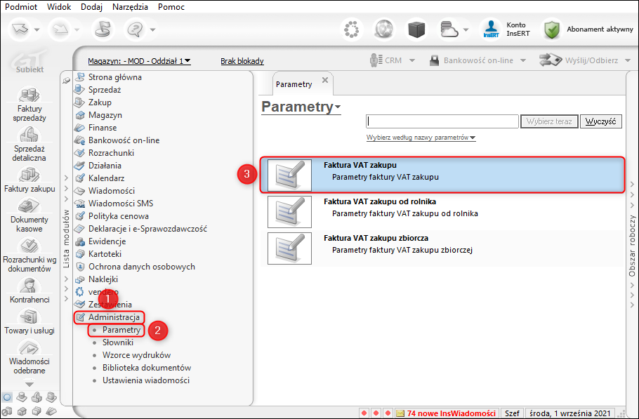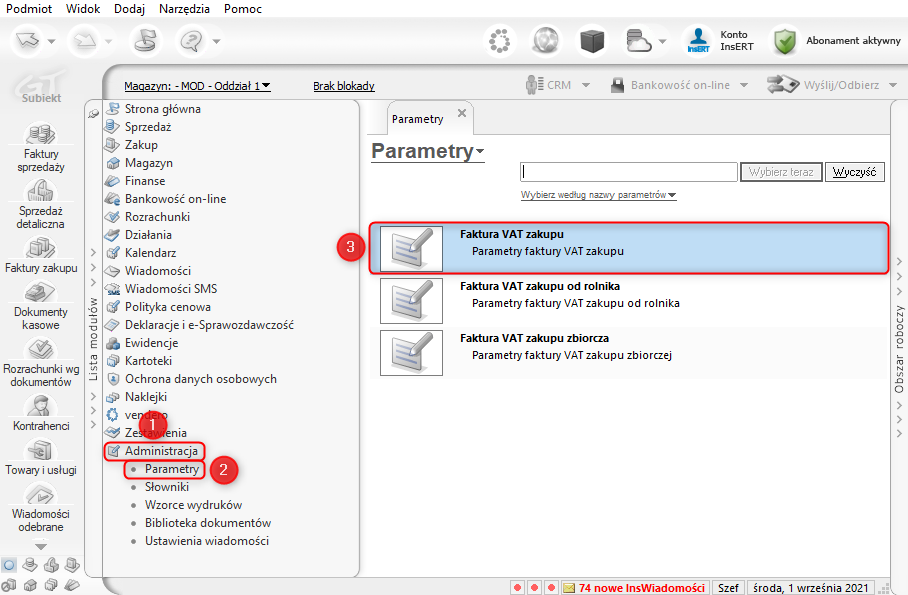 1. Z listy modułów wybrać Administracja – Parametry, a z listy parametrów Faktura VAT zakupu.