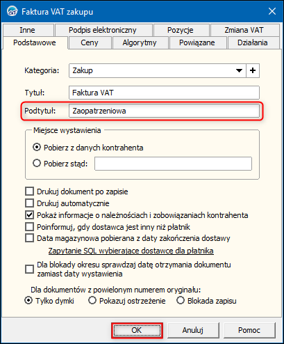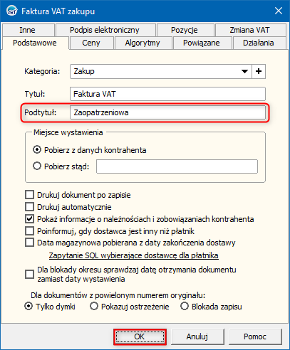 Subiekt GT – Jak ustawić domyślny podtytuł faktury VAT zakupu?