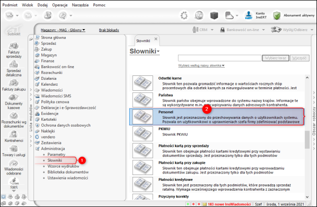 1. Zalogować się na użytkown​ika Szef, a następnie z listy modułów wybrać Administracja – Słowniki, a następnie z listy słowników wybrać Personel.​​​​​​​​​​