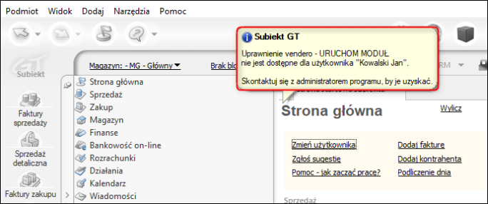 Rezultatem odebrania uprawnień będzie blokada modułu potwierdzona odpowiednim komunikatem.