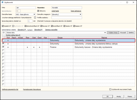 3. Na liście uprawnień odznaczyć pozycję o nazwie Dokumenty – zmiana daty wystawienia faktury sprzedaży. Aby zapisać zmiany, należy wybrać OK.