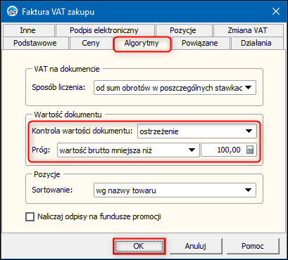 2. W oknie, które się wyświetli przejść na zakładkę Algorytmy i dokonać ustawień w sekcji Wartość dokumentu. Wskazać sposób kontroli wartości (ostrzeżenie, które pozwala zapisać dokument lub blokada zapisu) i ustawić Próg. Zmiany zapisać przyciskiem OK.