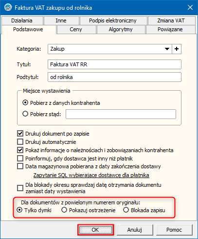 2. W oknie, które się wyświetli wybrać w polu Dla dokumentów z powielonym numerem oryginału jedną z trzech opcji: