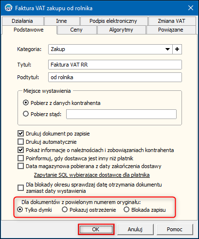 Subiekt GT – Jak ustawić zachowanie programu podczas próby wpisania powielonego numeru oryginału na fakturze VAT zakupu od rolnika?